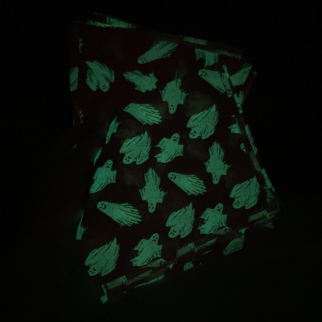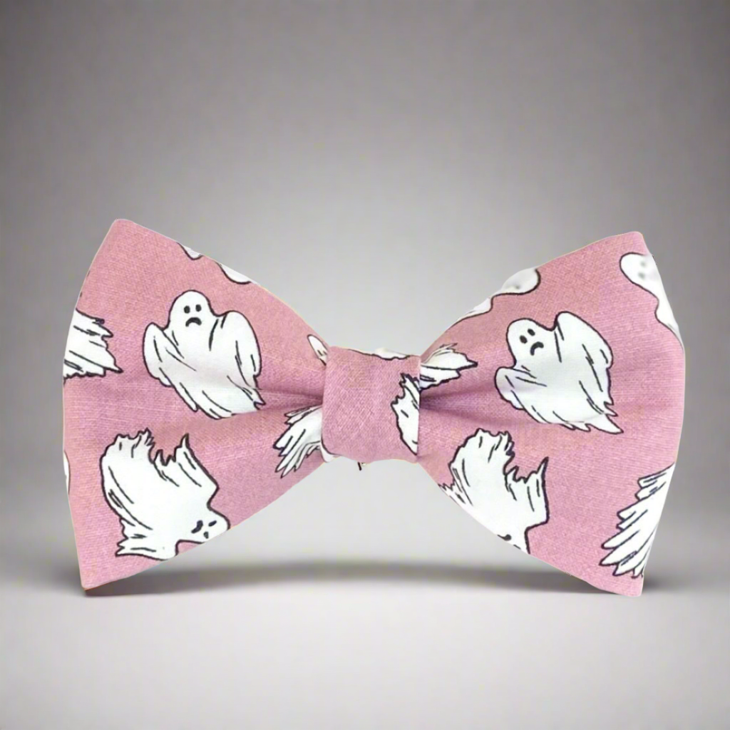Spooky Halloween ghosts glow in the dark as they float across this Halloween dog bow tie pet accessory. Classic loop bow with firm stabilizer so bow holds its shape well. Choose headband or collar option! Bow can be worn on the head (finished with a nylon band), or as a collar or harness accessory (finished with Velcro).