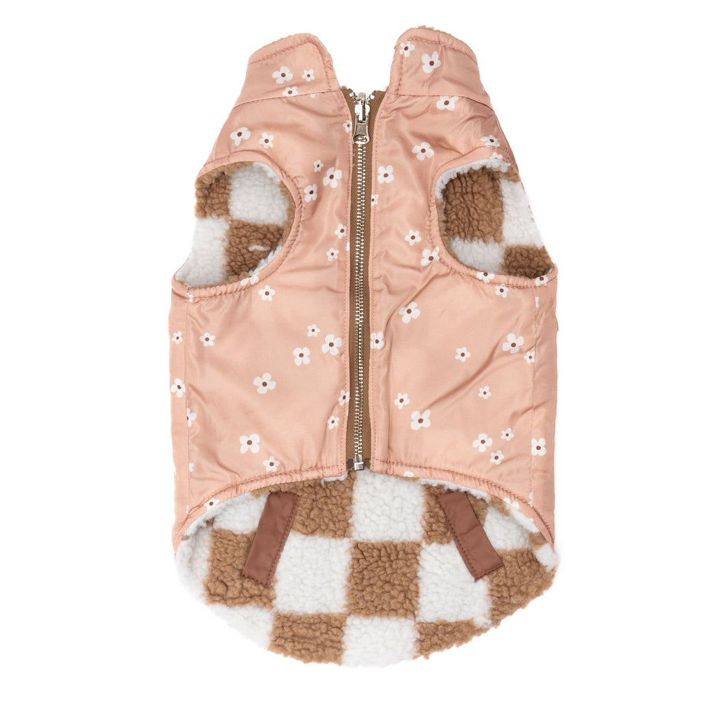 Well isn't your pup looking justas cute as can be! This warm and fuzzy Playing Checkers dog jacket is sweeping winter wardrobes and blanketing its wearers in a big bear hug! We had the on-the-go dog in mind when we designed these: zip closures and a leash clasp opening on the back side of the vest make getting out the door easy.