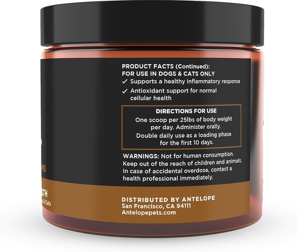 Recommended Dosage: Give one heaping scoop per 25 lbs of body weight daily. Administer orally by sprinkling it over your pet’s wet or dry food.